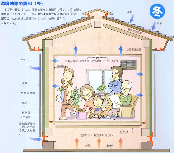◇ 冬は外と内の二重の断熱効果・地熱の利用で零かくなります。各部屋の温度差が少ないのでコールドショックが少なく、高血圧の方も安心です。
