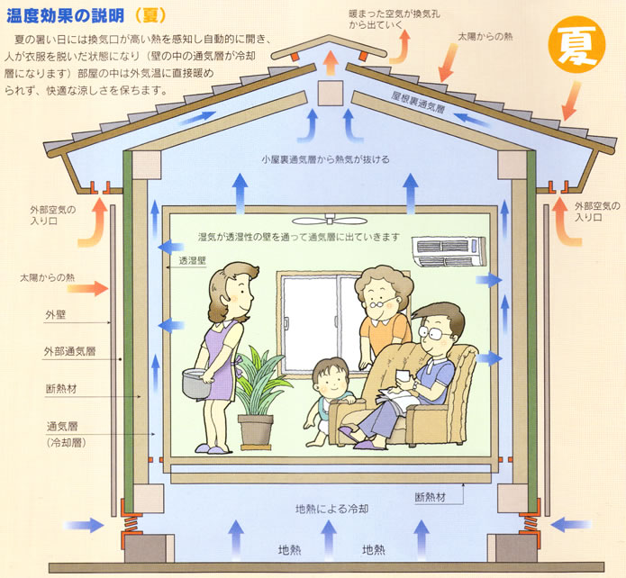 夏は住宅の壁の中、屋根裏、特に断熱材などの部材が夏の日差しによる熱を蓄積し、その熱を放出するので夜になっても部屋の中が熱く、適温にする為には必要以上のエネルギーが消費されます。