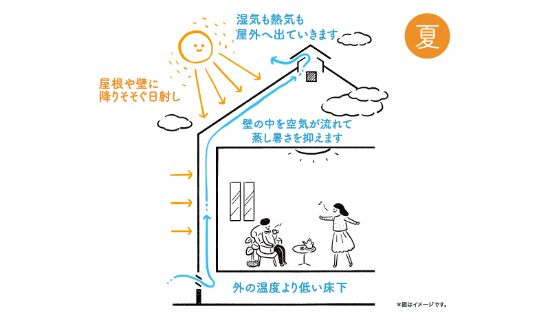 壁の中を空気が流れるから、無駄な湿気も夏の熱気も家にこもりません。