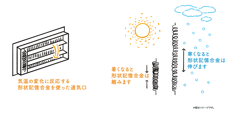 WB HOUSEは、各通気口に、気温の変化で伸縮する形状記憶合金を利用しています。